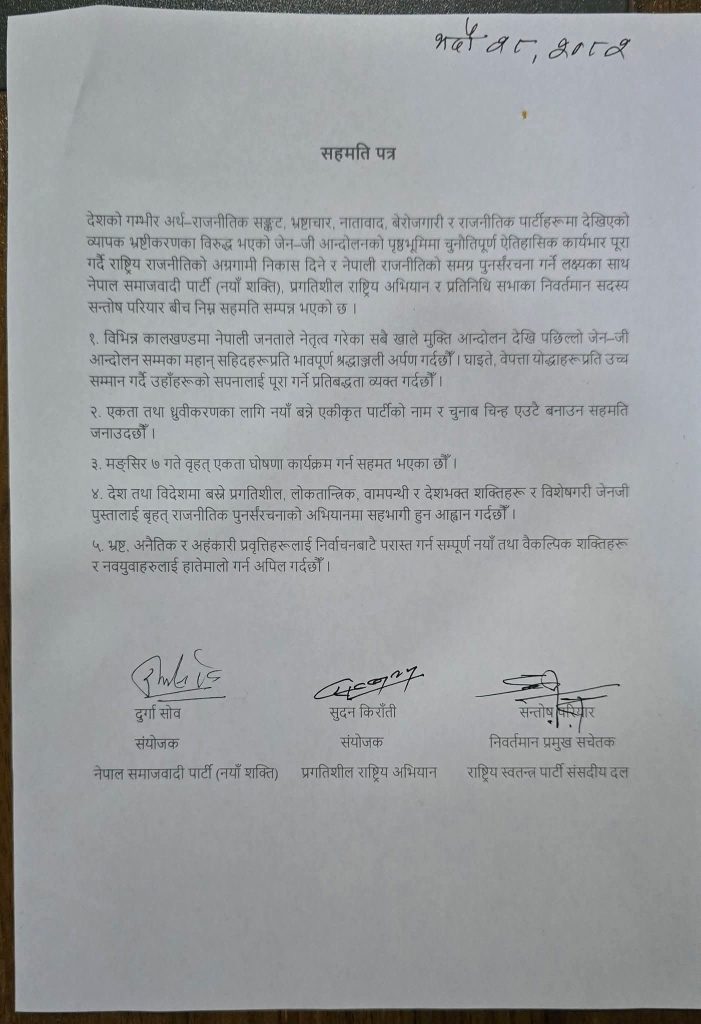 सहमति पत्रमा दुर्गा सोब, सुदन किराँती र सन्तोष परियारका हस्ताक्षर छन्। राजनीतिक वृत्तमा यो सहमति आगामी दिनमा मुलुकको वैकल्पिक राजनीतिक शक्तिको आधारशिला बन्नसक्ने ऐतिहासिक कदमका रूपमा हेरिएको छ।