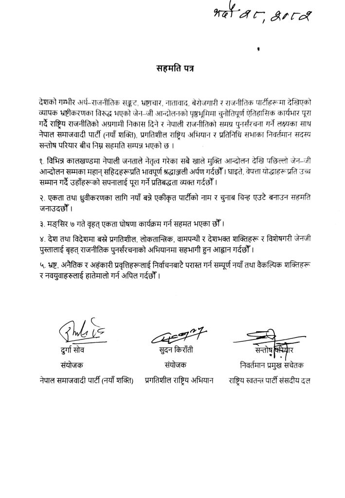 नेपाल समाजवादी पार्टी (नयाँ शक्ति)का संयोजक दुर्गा सोप,प्रगतिशील राष्ट्रिय अभियानका संयोजक सुदन किराँती र राष्ट्रिय स्वतन्त्र पार्टीका निर्वतमान प्रमुख सचेतक सन्तोष परियारबीच शुक्रबार लिखित सहमति पत्रमा हस्ताक्षर गरिएको हो।