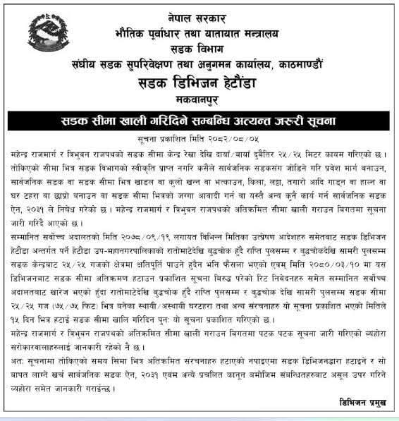 महेन्द्र राजमार्ग र त्रिभुवन राजपथको सडक सीमा खाली गराउन हेर्टौंडा सडक डिभिजनको सार्वजनिक सूचना जारी