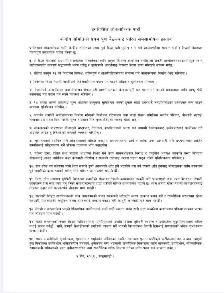 काठमाडौँ । प्रगतिशील लोकतान्त्रिक पार्टीको केन्द्रीय समितिको प्रथम पूर्ण बैठक यही पौष १ र २ गते काठमाडौँमा सम्पन्न भएको छ । बैठकले देशको समसामयिक राजनीतिक, सामाजिक तथा आर्थिक अवस्थासँग सम्बन्धित १५ बुँदे महत्वपूर्ण प्रस्ताव पारित गरेको छ ।